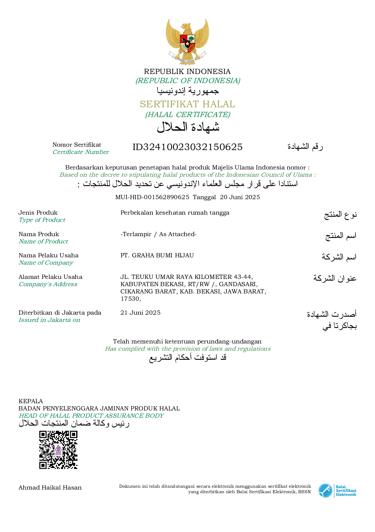 PT Graha Bumi Hijau has officially obtained Halal Certification from BPJPH, an authorized and recognized institution responsible for ensuring compliance with Halal standards. This certification signifies that the entire production process, from the selection of raw materials, processing, to packaging, has undergone thorough inspection and meets strict Halal requirements.